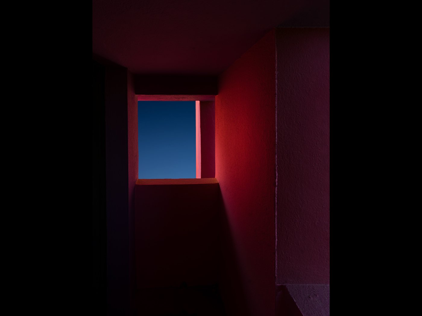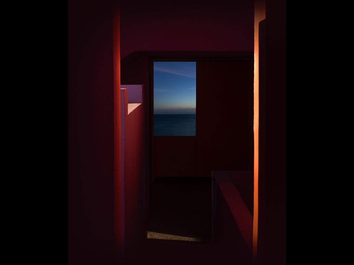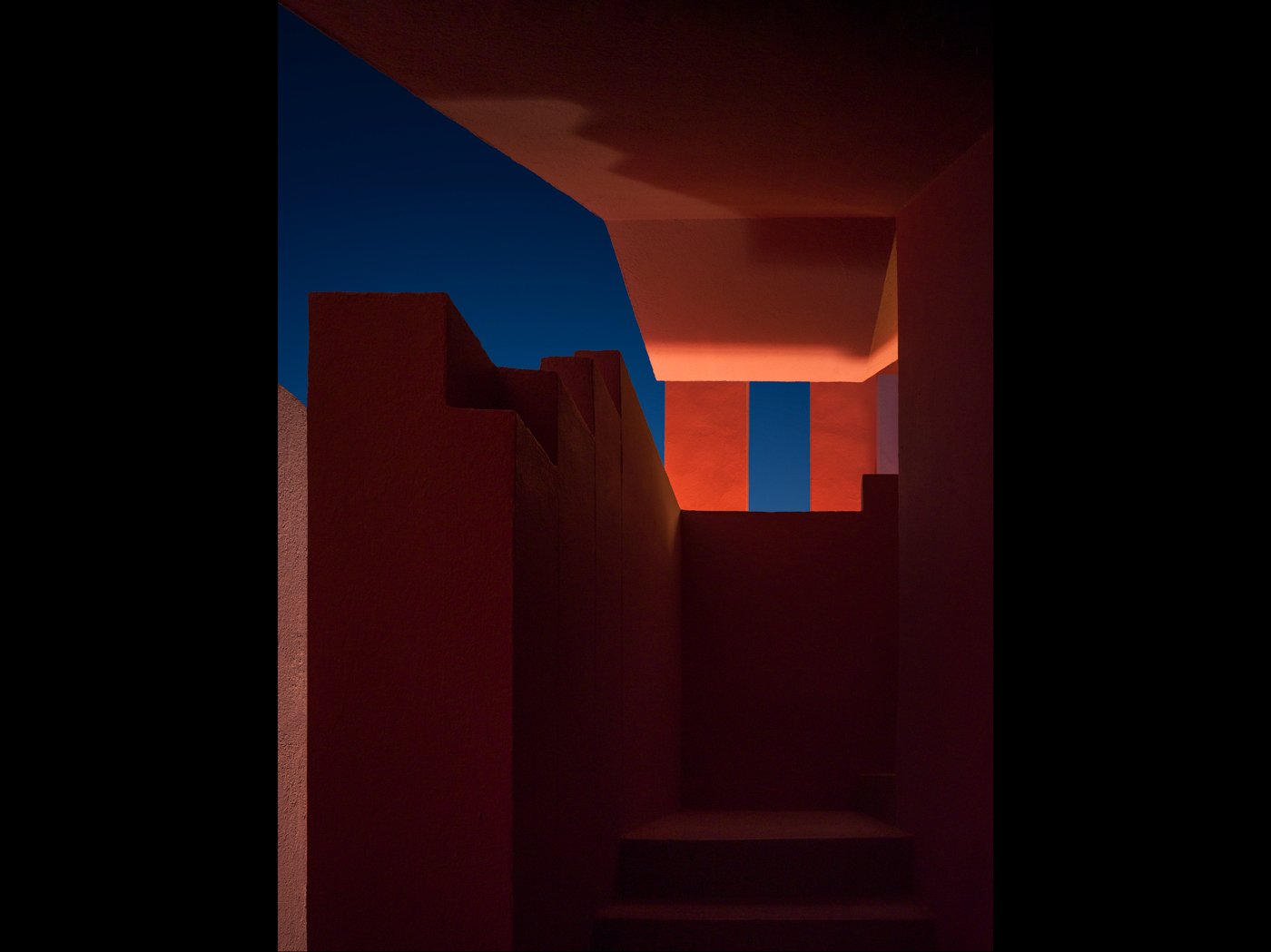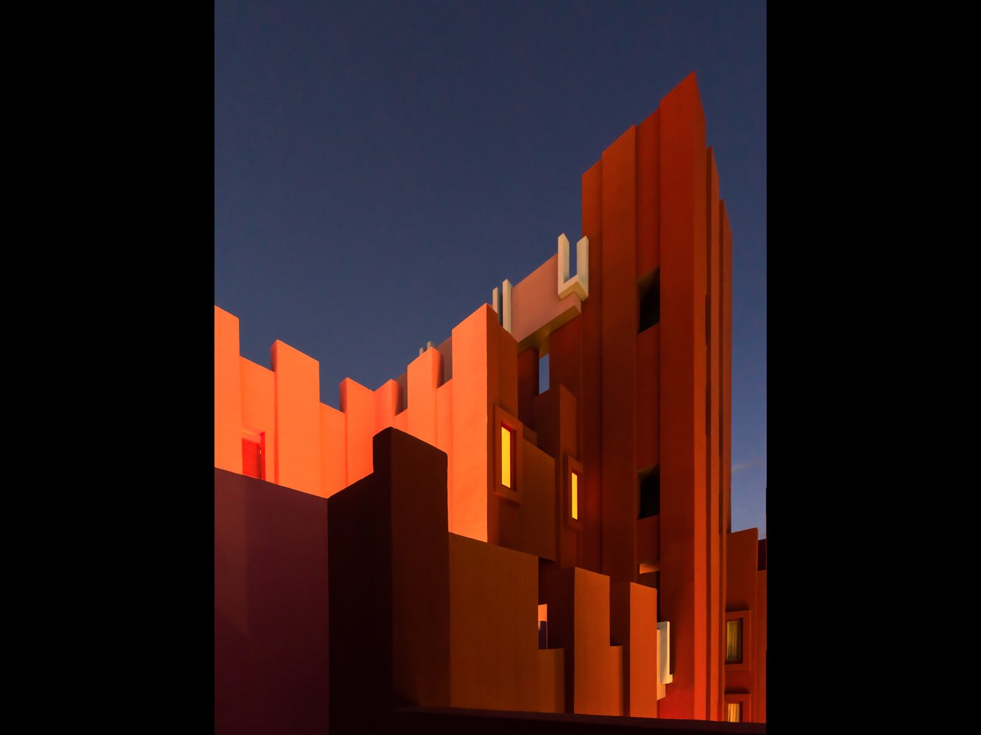 The labyrinth of Muralla Roja rendered at dusk and night.Colour, geometry and shadow merge into a dreamlike study of place.